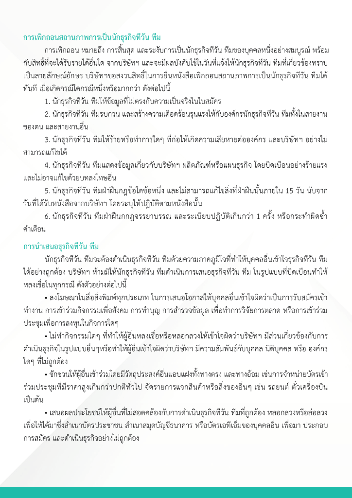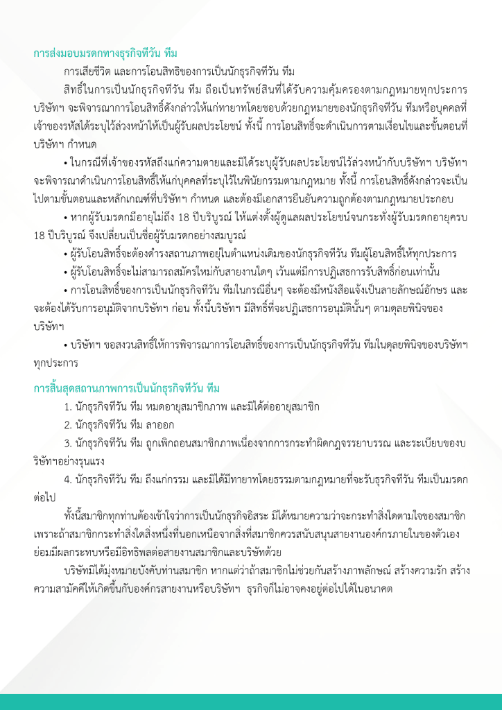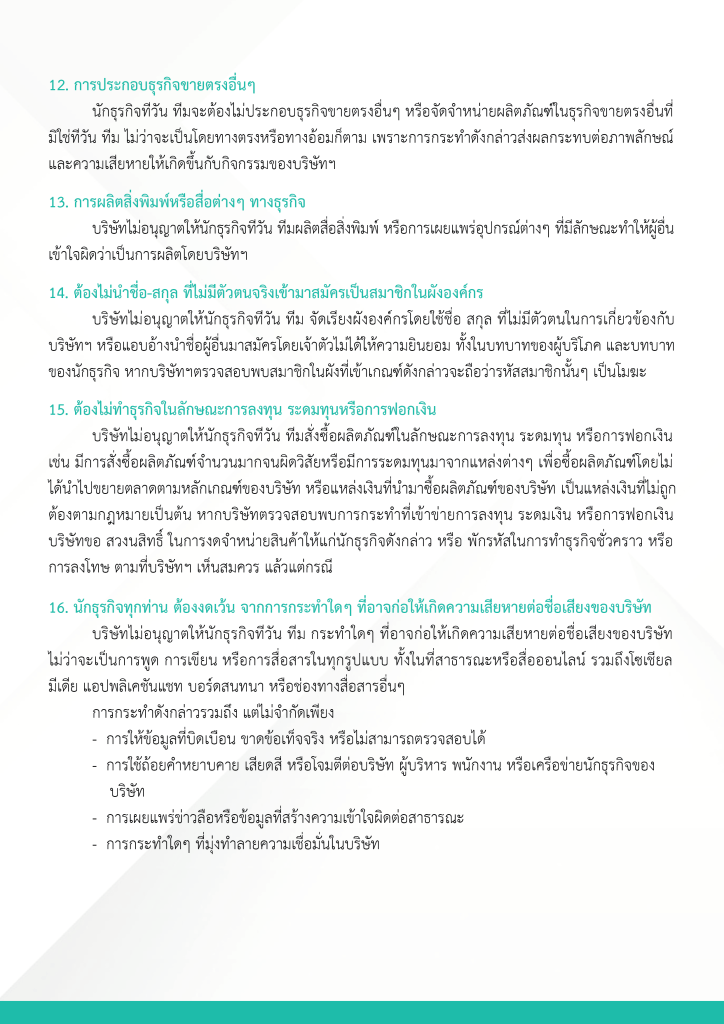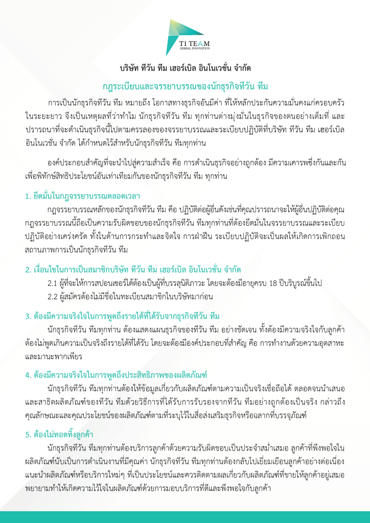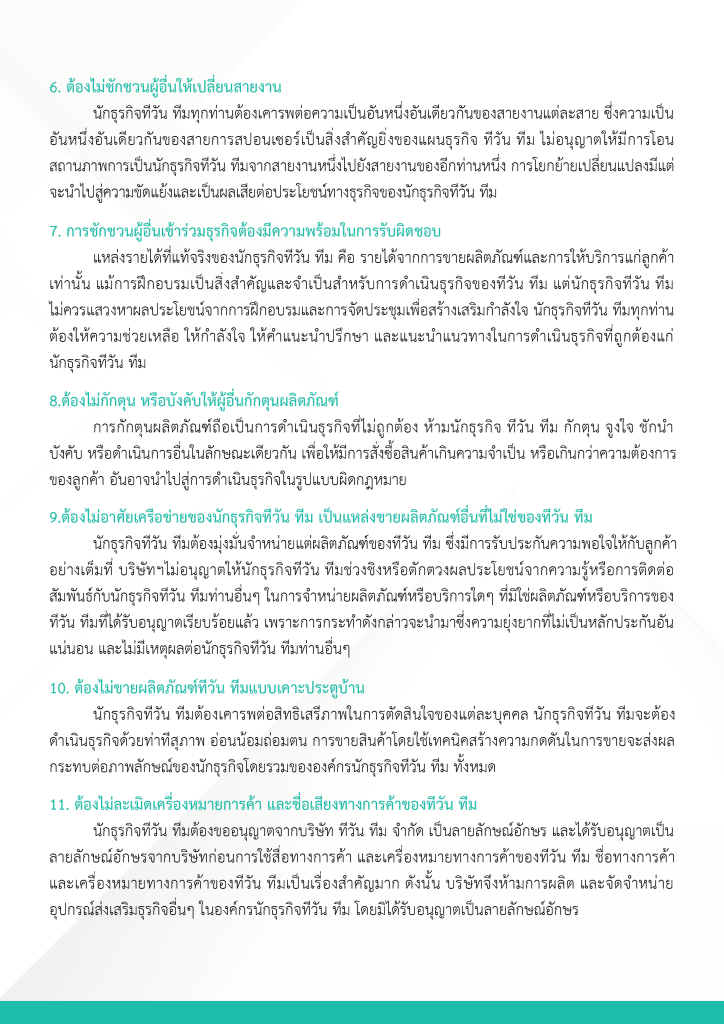 นักธุรกิจ ทีวัน ทีม ทุกคนต้องเคารพต่อความเป็นอันหนึ่งอันเดียวกันของสายงานแต่ละสาย ทีวีน ทีม ไม่อนุญาตให้มีการโอนสถานภาพการเป็นนักธุรกิจทีวัน ทีมจากสายงานหนึ่งไปยังสายงานของอีกท่านหนึ่ง การโยกย้ายเปลี่ยนแปลงมีแต่จะนำไปสู่ความขัดแย้งและเป็นผลเสียต่อประโยชน์ทางธุรกิจของนักธุรกิจทีวัน ทีม